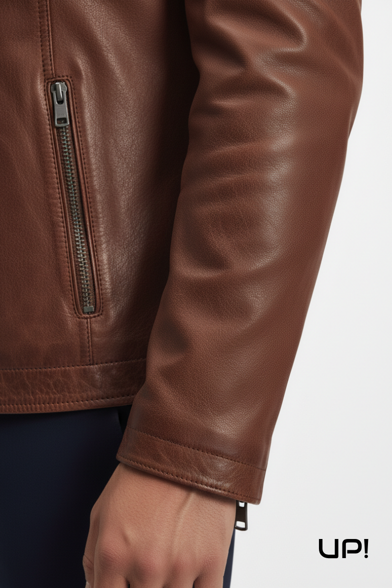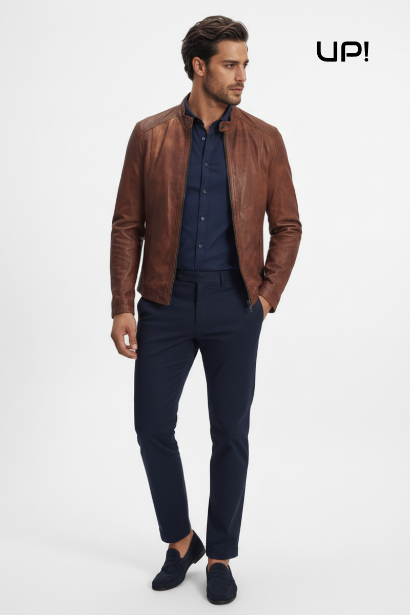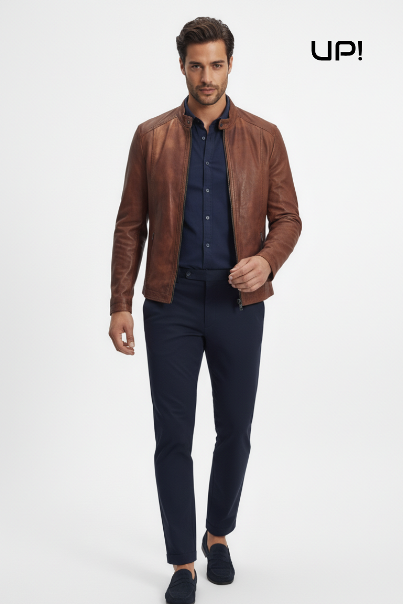 L’Alessio UP034 è un biker da uomo realizzato in pelle Denver Oil, nella calda tonalità cuoio, pensato per chi ama uno stile deciso ma equilibrato, capace di unire carattere artigianale ed eleganza contemporanea. Un capo iconico e versatile, ideale per completare look casual, urban o più ricercati.