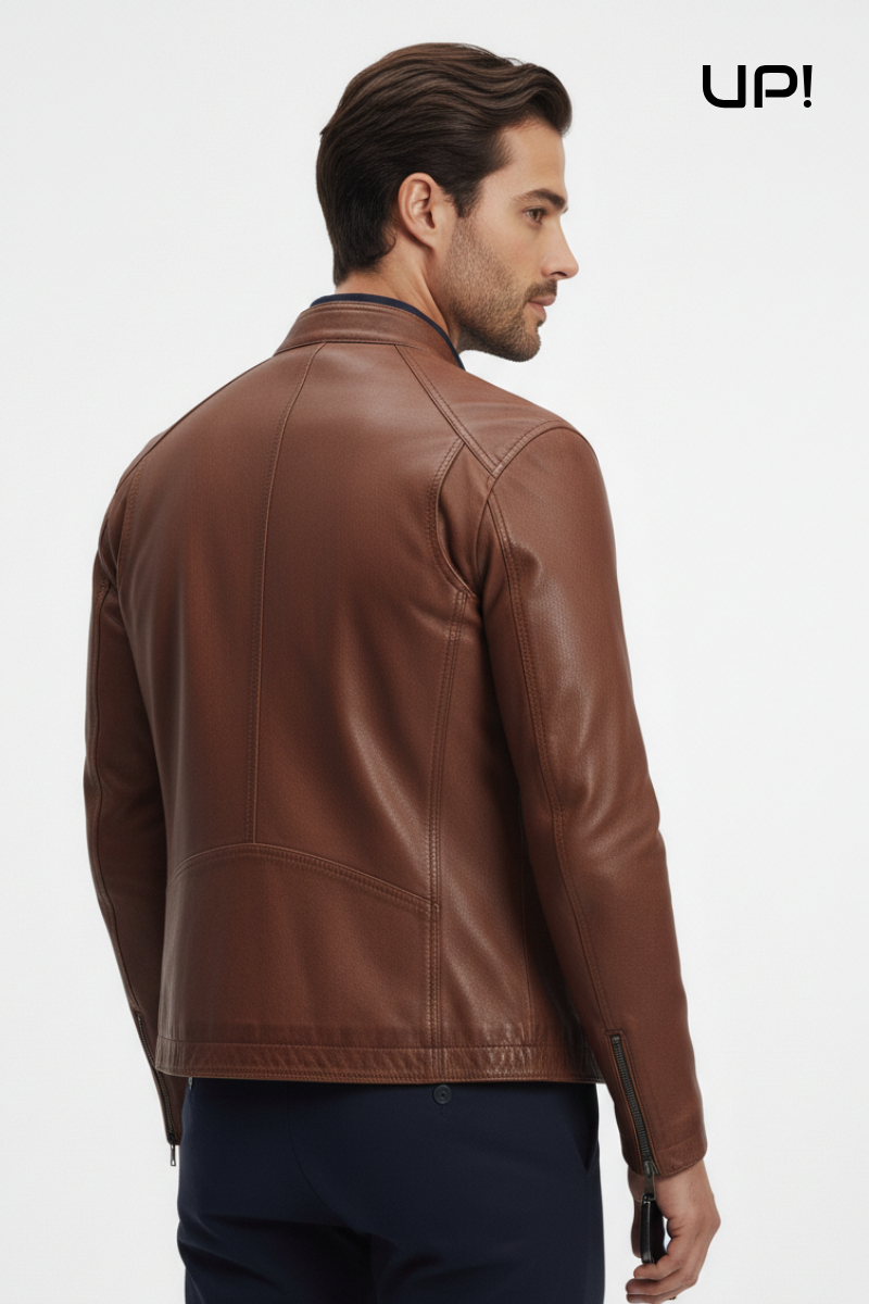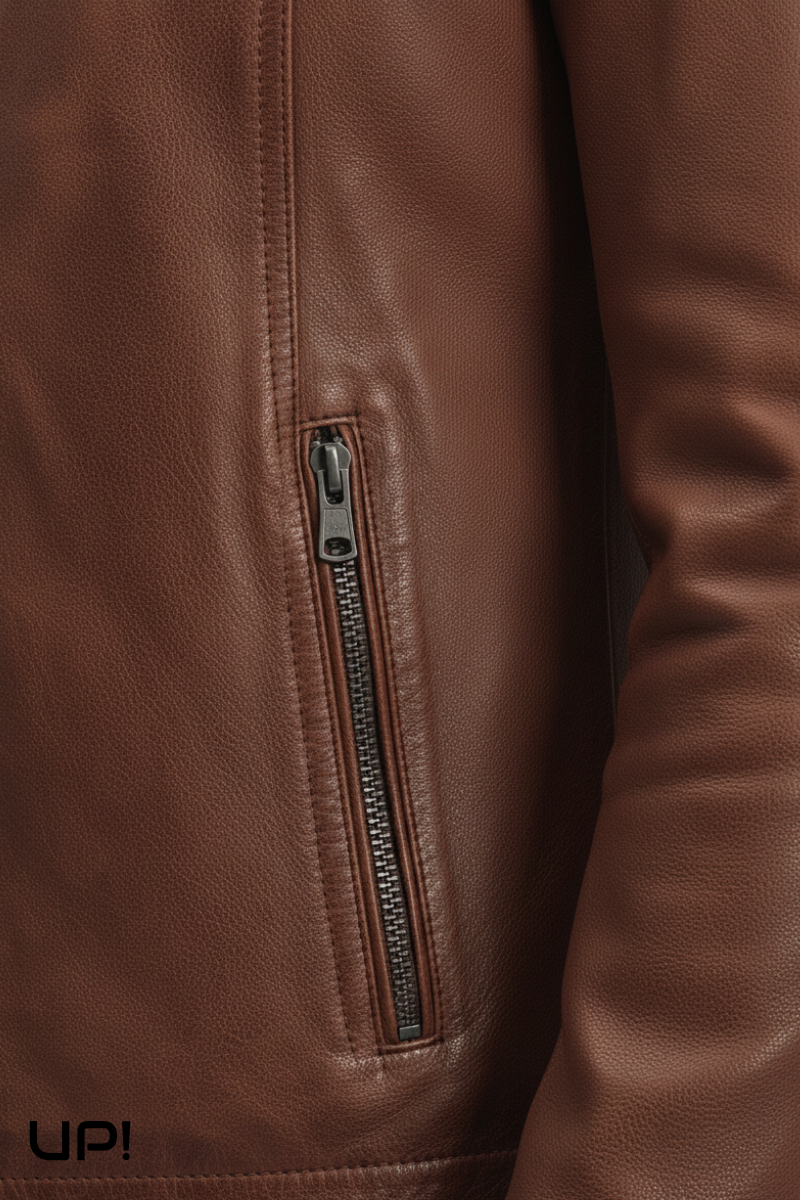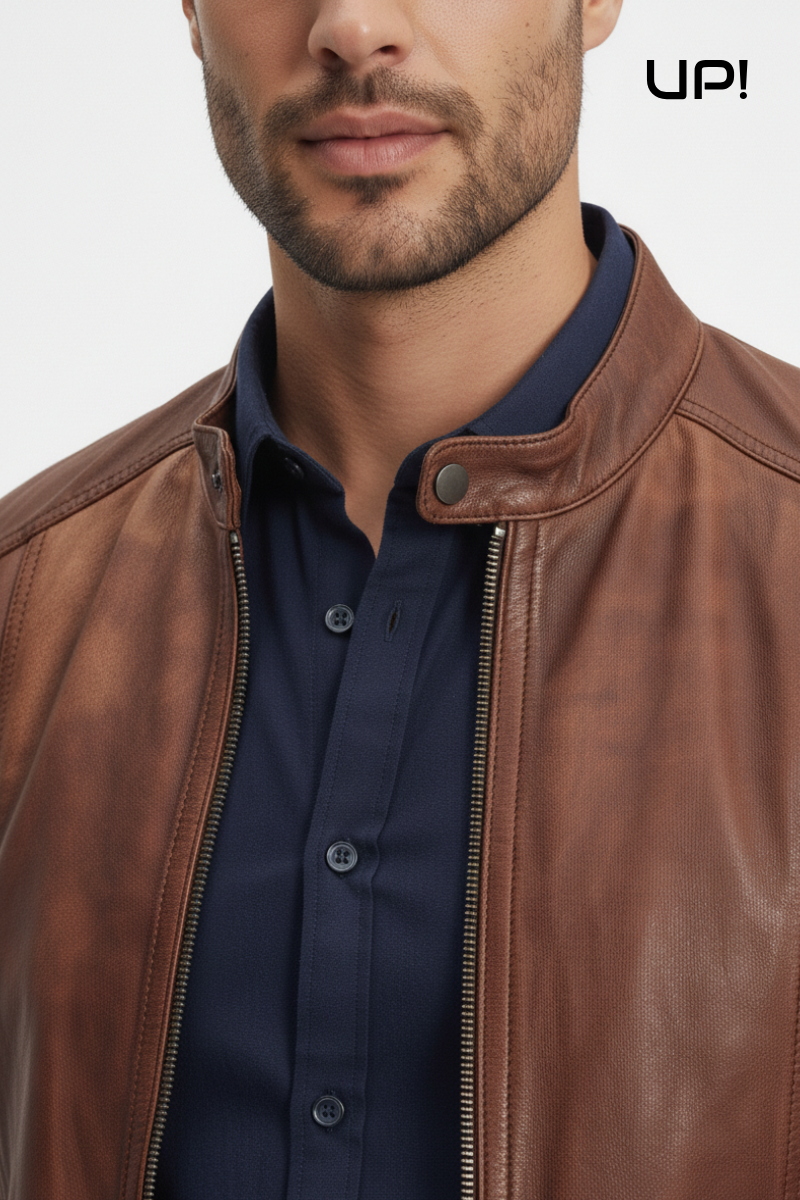 Biker da uomo in pelle Denver Oil color cuoio, dal design essenziale e vestibilità slim. Con collo coreano, chiusura zip e interno in cotone, unisce stile classico e moderno in un capo di qualità premium.