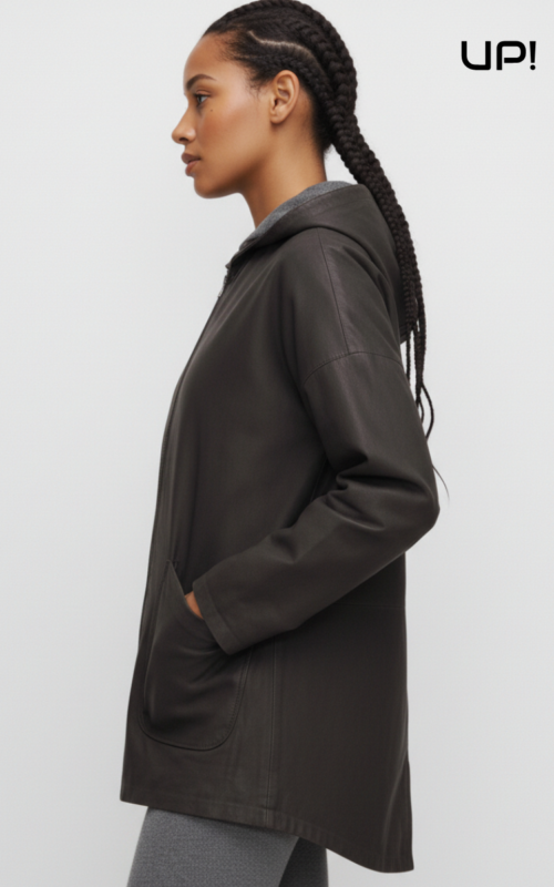 la zip trasversale, il collo giacca strutturato, le zip alle maniche e la cintura con passanti definiscono l’identità del capo. Le tre tasche frontali con zip completano il modello con funzionalità e pulizia formale.
